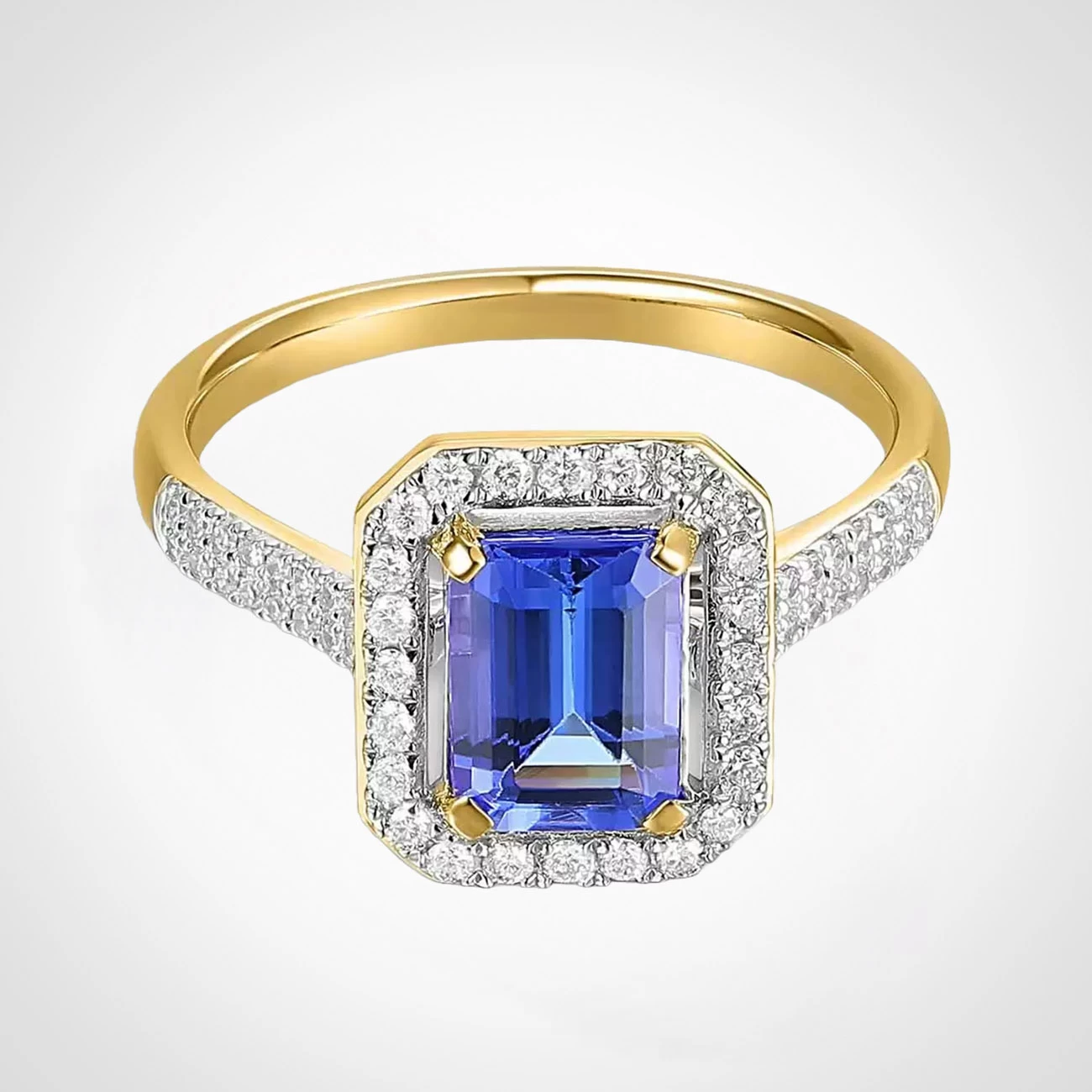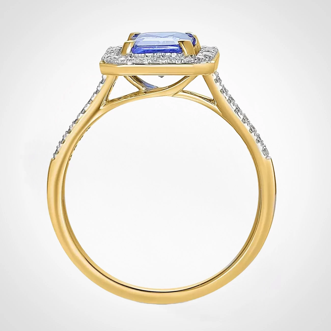 Pierścionek z żółtego złota z tanzanitem otoczonym diamentami
